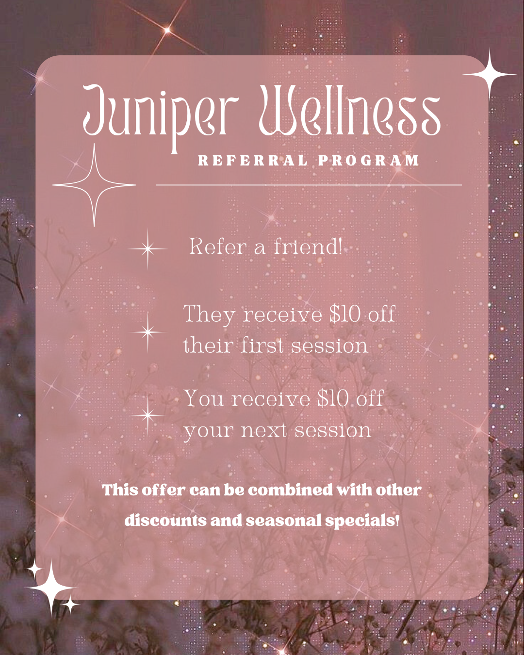 When you refer a friend to Juniper Wellness, they’ll receive $10 off their first session, and you’ll get $10 off your next. Just make sure they mention your name on their intake form. Thank you for helping my small business grow!